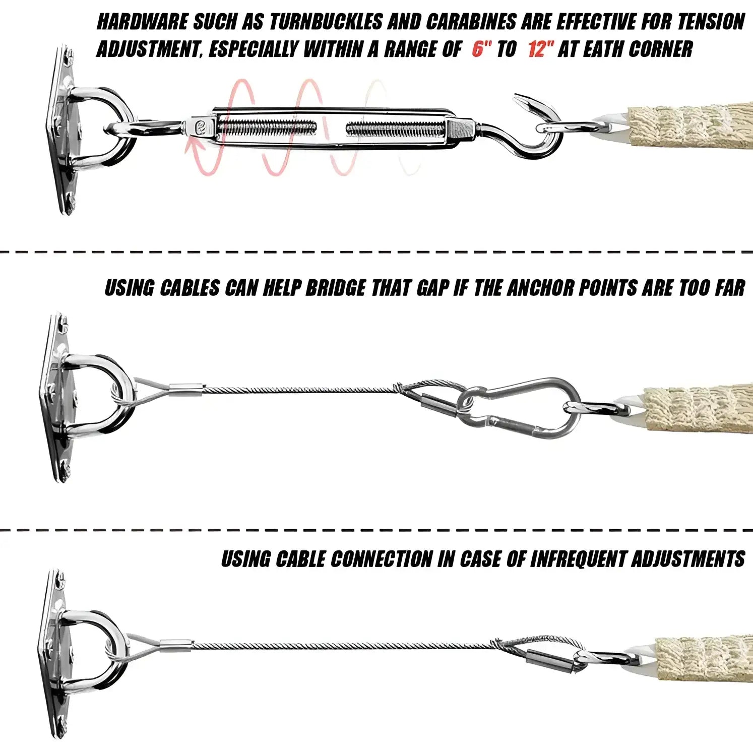 - Attach the shade sail's metal D-rings to the anchor points using ropes, carabiners, or bungee cords. Use turnbuckles on two corners for precise tension adjustments.