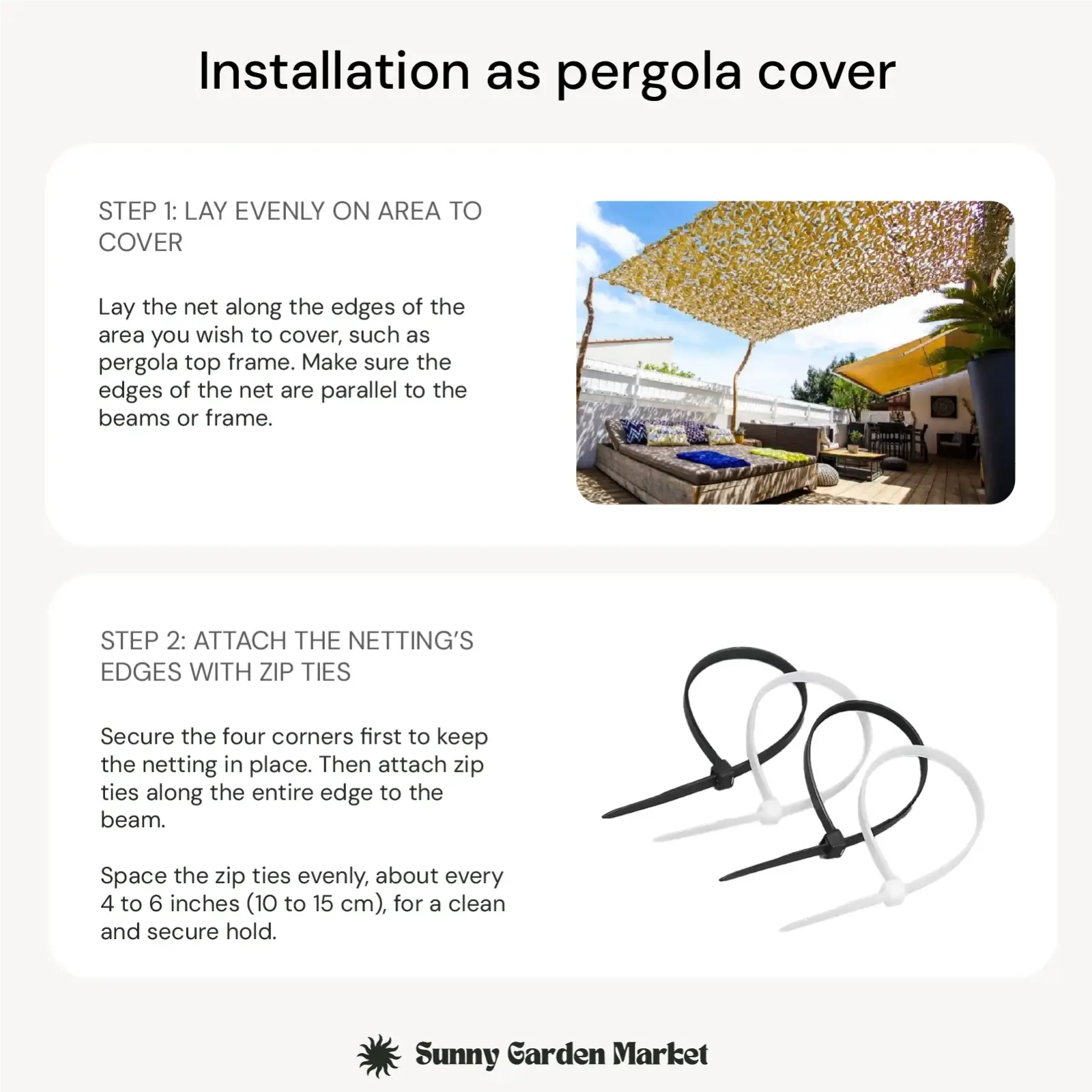 Option 2: Fixing as a cover with zip ties (Ideal for pergolas)