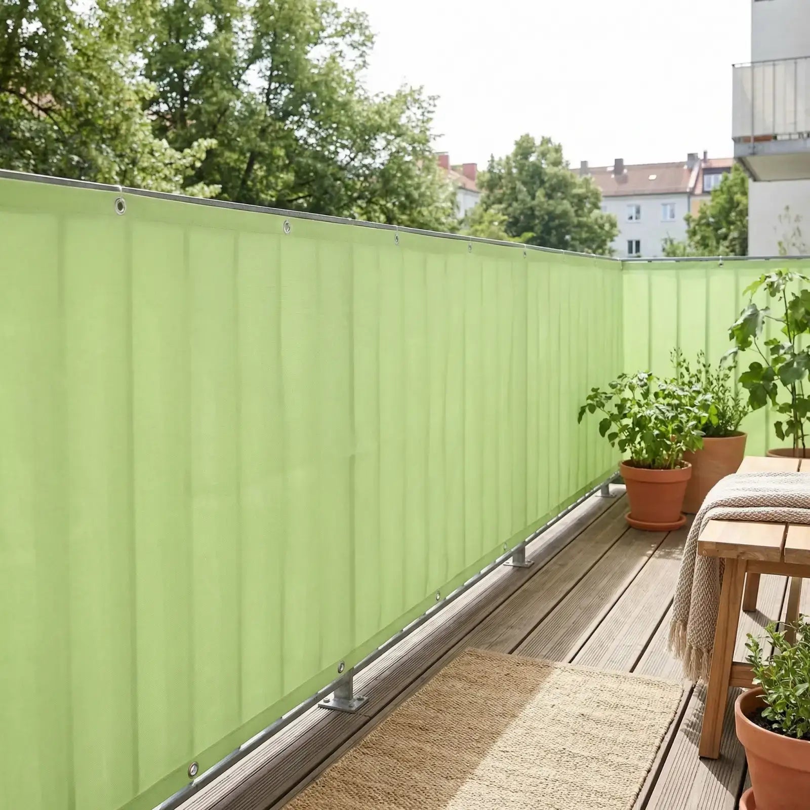 This light green fabric privacy screen provides a cheerful and serene way to enhance privacy in your outdoor space. With its durable construction, easy installation, and soft, inviting color, it’s an ideal addition to any balcony, deck, or patio.
